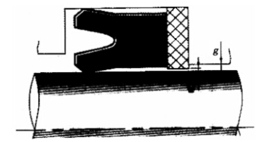 Y型密封圈受壓時(shí),其根部形狀會(huì)出現(xiàn)壓縮變形,導(dǎo)致寬度尺寸變大,高度變小,工作壓力不同時(shí),密封圈根部寬度距缸體或活塞間隙g(半徑間隙,見(jiàn)圖6)取值大小與其使用壽命密切相關(guān);若擠出間隙對(duì)于工作壓力來(lái)說(shuō)取值過(guò)大,密封件根部可能因自身受壓而損壞 (見(jiàn)圖7)關(guān)于擠出間隙g的選擇應(yīng)當(dāng)參考圖9進(jìn)行。根部高度的選擇應(yīng)參考HG4—335—66進(jìn)行。