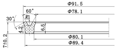 4)唇口裝配單邊過(guò)盈尺寸為 0.7~0.75mm,所以唇口部位外徑尺寸為91.5mm,內(nèi)徑尺寸為78.1mm。